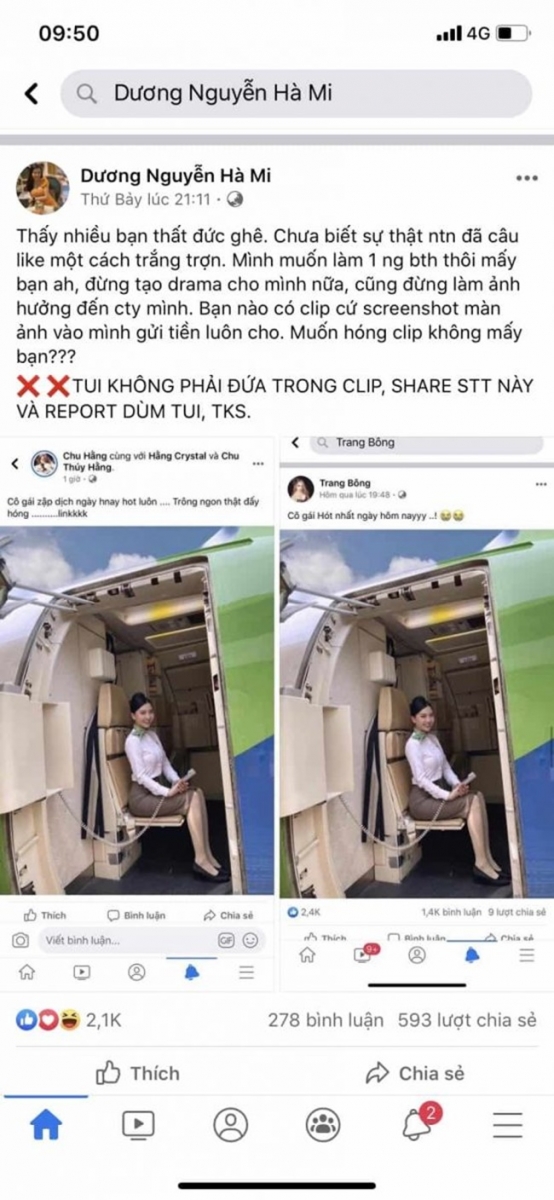 Thông tin chưa được xác thực, thì các tài khoản mạng xã hội đã thông tin về việc nữ tiếp viên của hãng Bamboo Airways lộ clip nóng, đồng thời đính kèm ảnh của Dương Nguyễn Hà Mi.